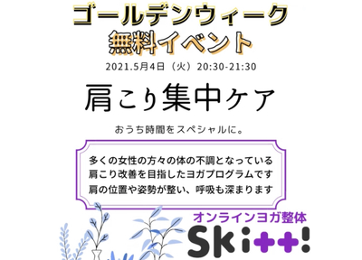 オンラインヨガ整体Skitt! ゴールデンウィーク無料イベント開催決定! そんなイベントの第1弾! 5月4日 20時30分開催 皆様の悩みにお答えする1時間! 「肩こり集中ケア」クラス 多くの女性...